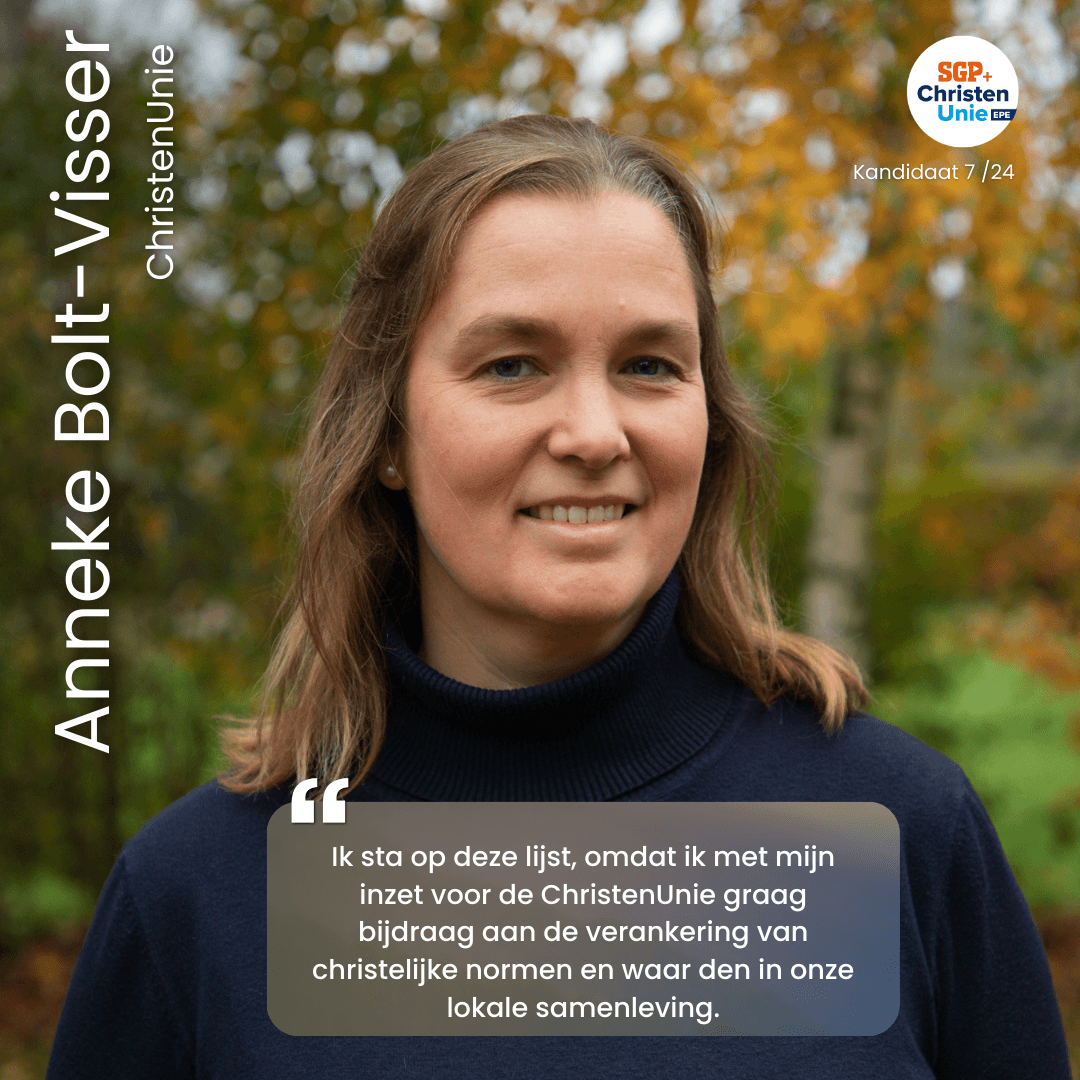 Anneke Bolt-Visser (ChristenUnie) uit Vaassen staat op onze lijst omdat zij zich graag wil inzetten voor het versterken van christelijke normen en waarden in onze lokale samenleving.